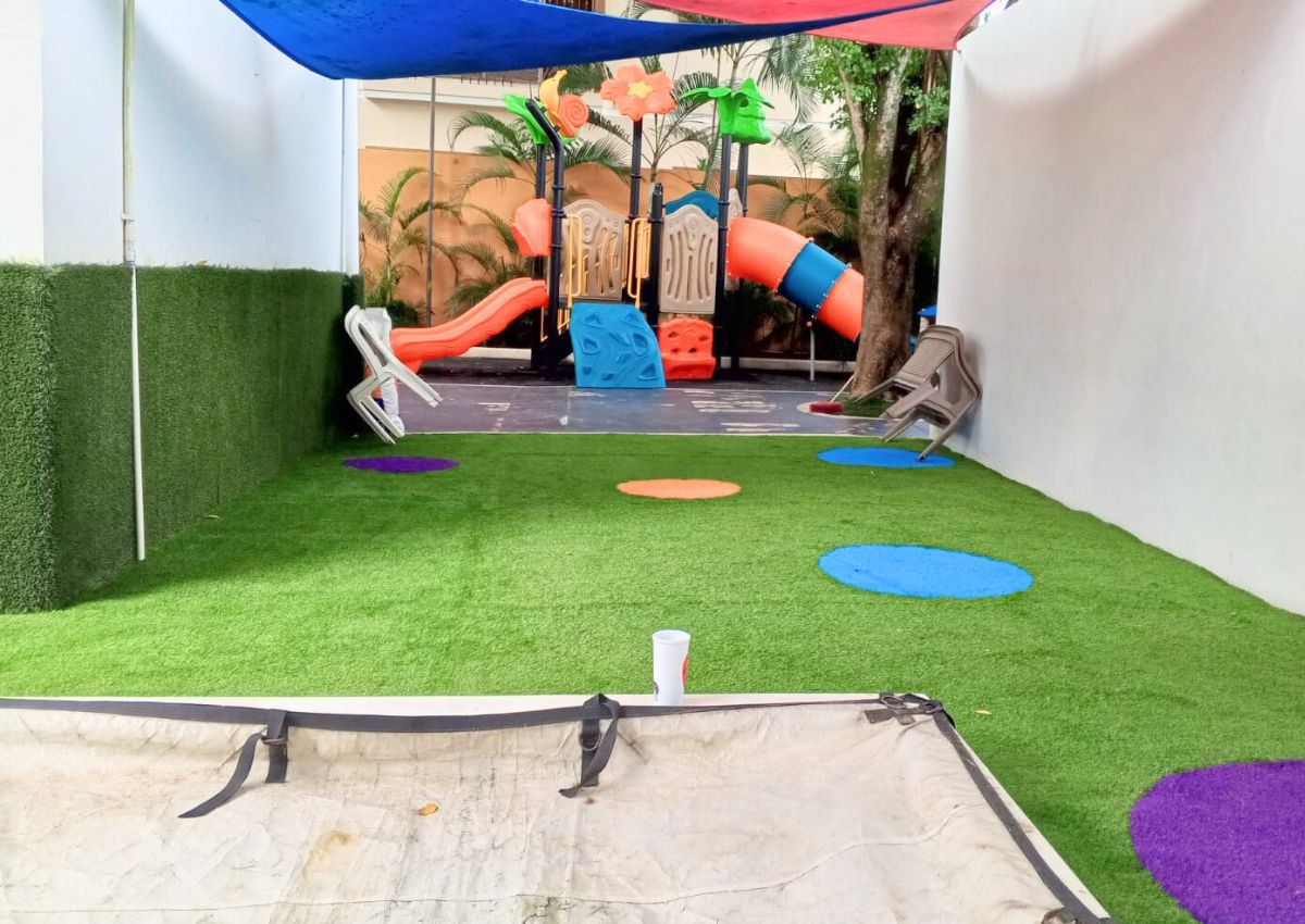 Estimulación de la creatividad y la imaginación: El área de juego invita a los niños a inventar sus propias historias y aventuras. La grama sintética de colores no solo añade seguridad, sino que también ofrece un espacio visualmente atractivo que estimula la creatividad de los niños.