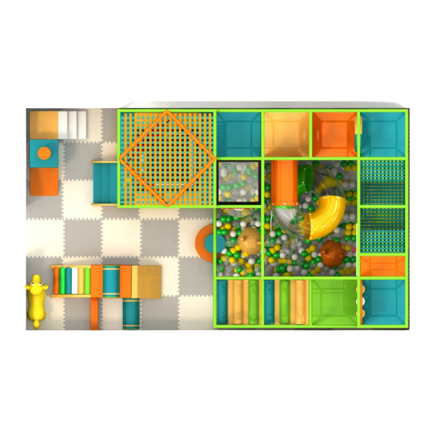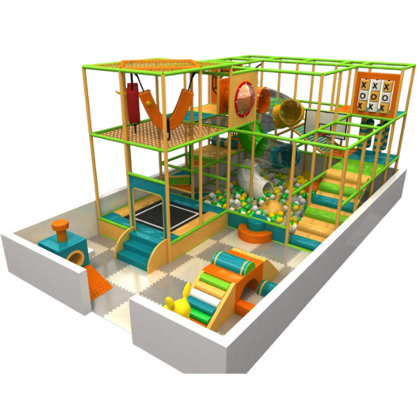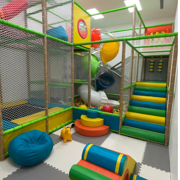 - Elementos blandos como plataformas y obstáculos tienen interior de madera tratada, con capa de espuma y tela lavable para confort y limpieza.
